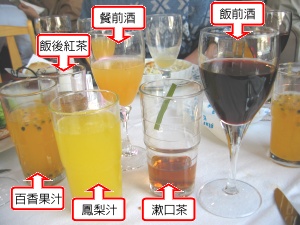 從進餐廳開始,桌上就有一杯茶是給你解渴用的;點完餐後,自己倒了一杯鳳梨汁,老弟多倒了一杯百香果汁給我喝,於是我就有兩杯果汁;服務生把餐前酒和麵包送上來,於是多了一杯飲料;在上牛排時,再送一杯紅酒來搭配,結果又多了一杯飲料;吃完牛排後,服務生把餐後飲料冰紅茶送到我面前,於是飲料再加一杯,前前後後共有6杯飲料。