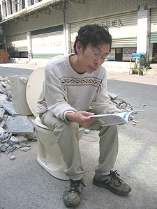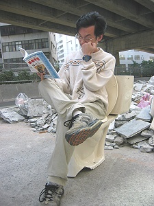 中午從五樓走下要去吃飯,一看到這座馬桶,立刻衝上去拿數位相機,然後在許多人觀看的情形下,老神在在的請光頭幫我拍照。